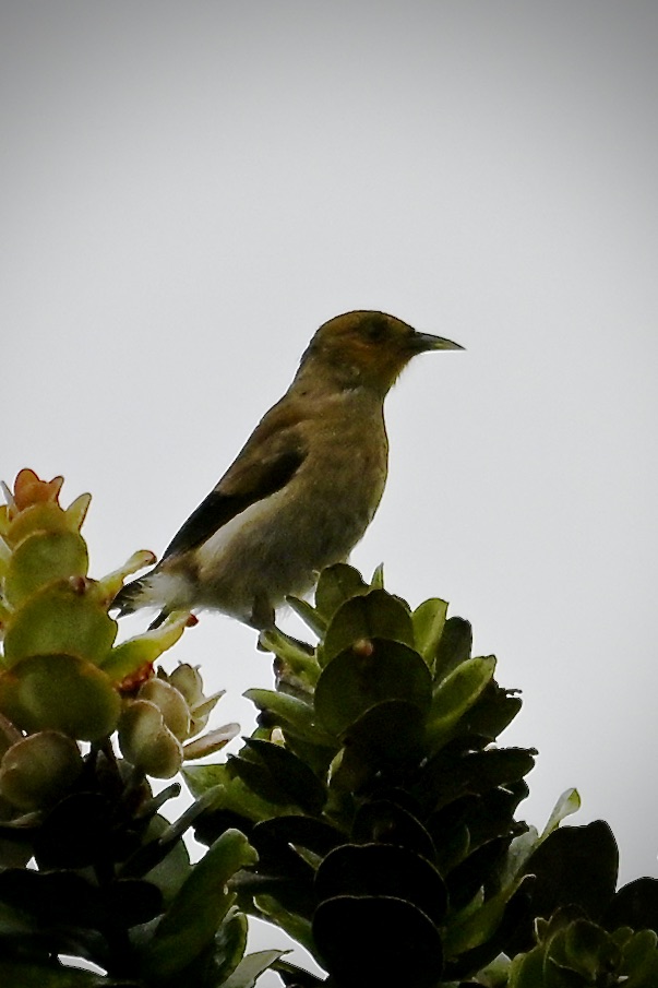 The ‘apapane was young. He didn’t have his red and black feathers yet. That was OK. He knew they’d come. He was content even with the somewhat odd look of red patches on his mostly white chest. He’d be wearing red and black soon.