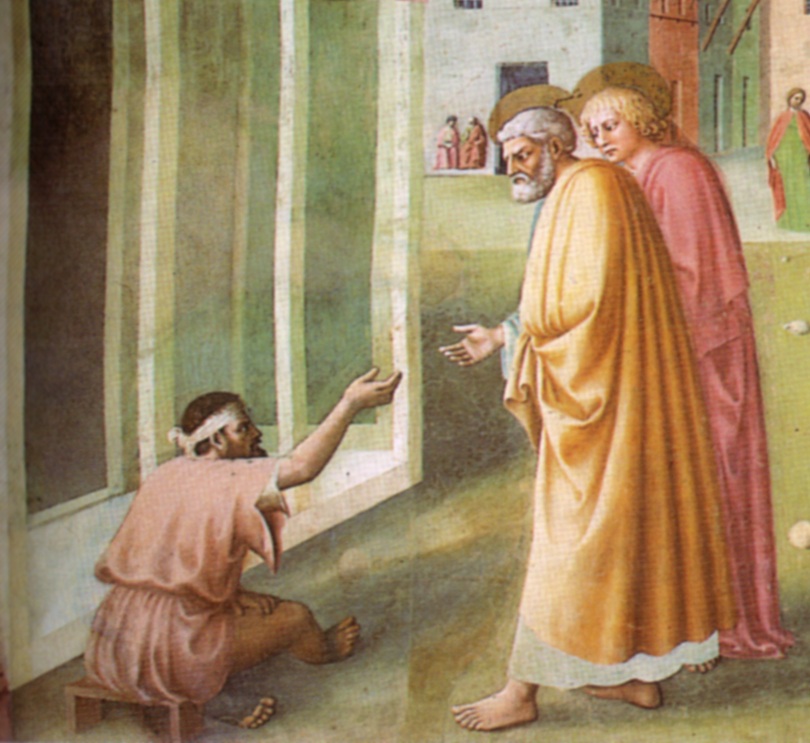 The image is a detail from Healing of the Cripple and the Raising of Tabitha by Masolino da Panicale (1424). Photo and crop: Cappella_brancacci, Guarigione_dello_storpio_e_resurrezione_di_Tabita(restaurato),Masolino.jpg: see filename or categoryderivative work: StAnselm (talk) – Cappella_brancacci,_Guarigione_dello_storpio_e_resurrezione_di_Tabita(restaurato),_Masolino.jpg, Public Domain, https://commons.wikimedia.org/w/index.php?curid=15047438.