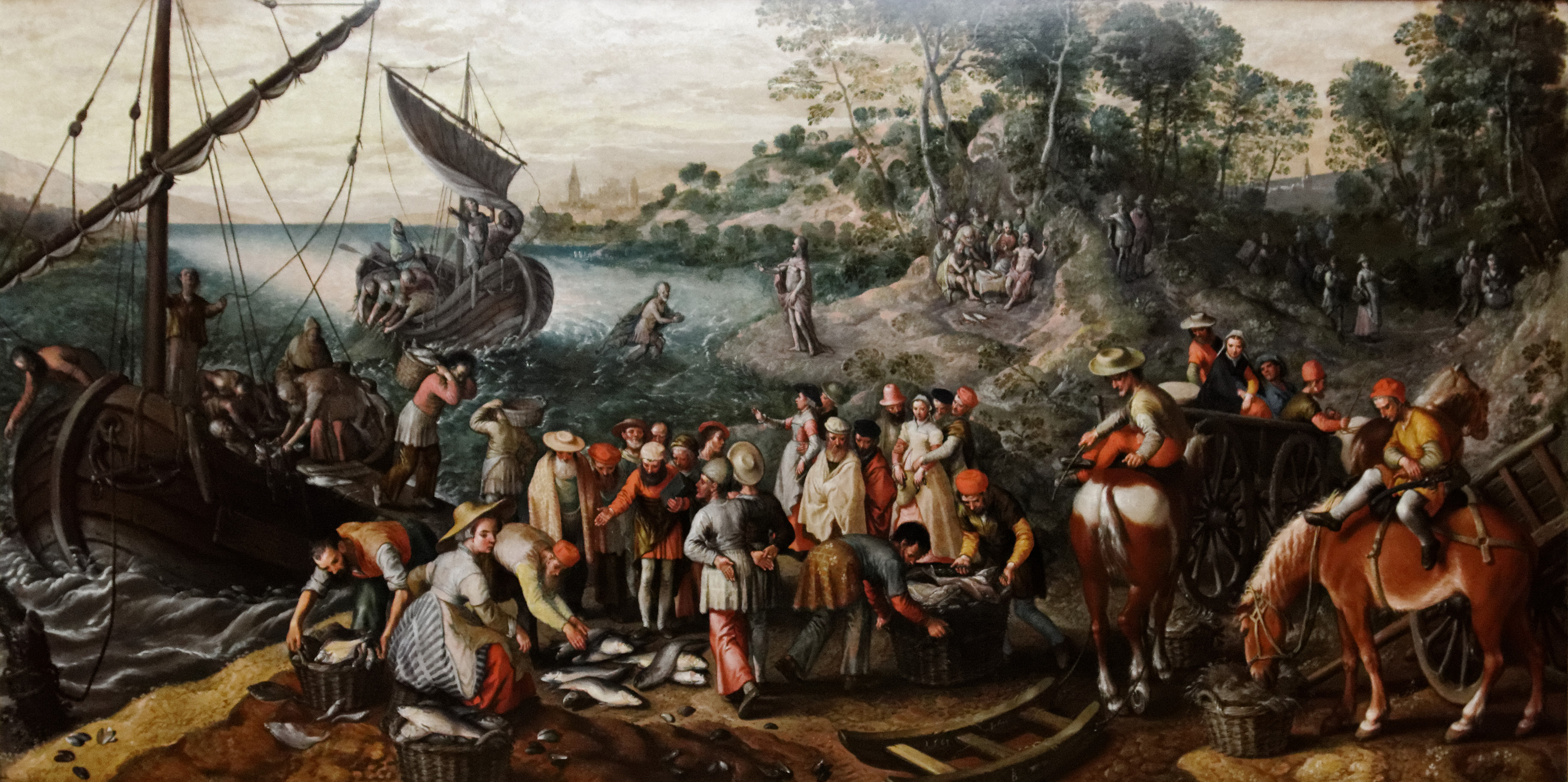 The image is The Miraculous Draught of Fishes by Joachim Beuckelaer (1563) – Own work, Public Domain, https://commons.wikimedia.org/w/index.php?curid=13268606.