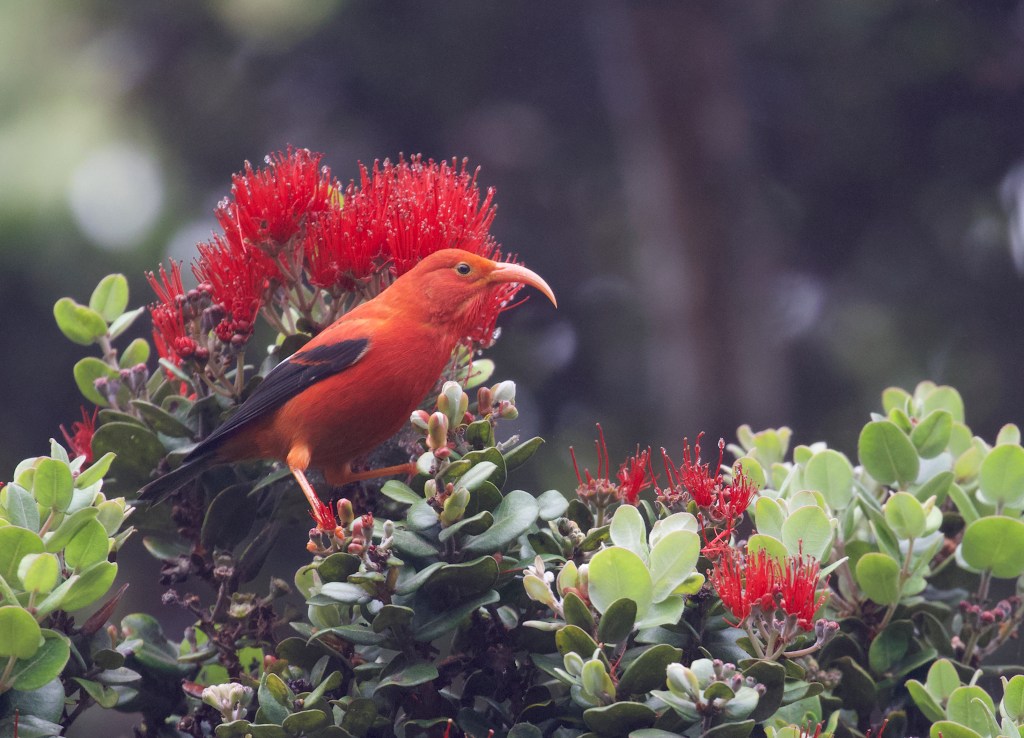 The two i’iwi – I don’t know whether they were husband and wife or brother and sister or cousins or friends, but there was he and there was she – were very excited. Setting out early in the morning, they had found an ohi’a tree that had gone into full blossom overnight. From its lowest branches to the tip of its crown, it glowed bright red in the dawn. The scent of nectar – which I can’t smell, can you? But they could – wafted out among the other trees, some of which had a few blossoms, but nothing compared to this marvel.