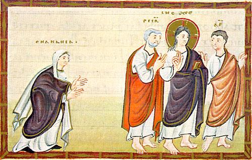 The image is Jesus and the Woman of Canaan by unknown artist (ca. 980 – 993) – Codex Egberti, Fol 35v, Public Domain, https://commons.wikimedia.org/w/index.php?curid=8096755.