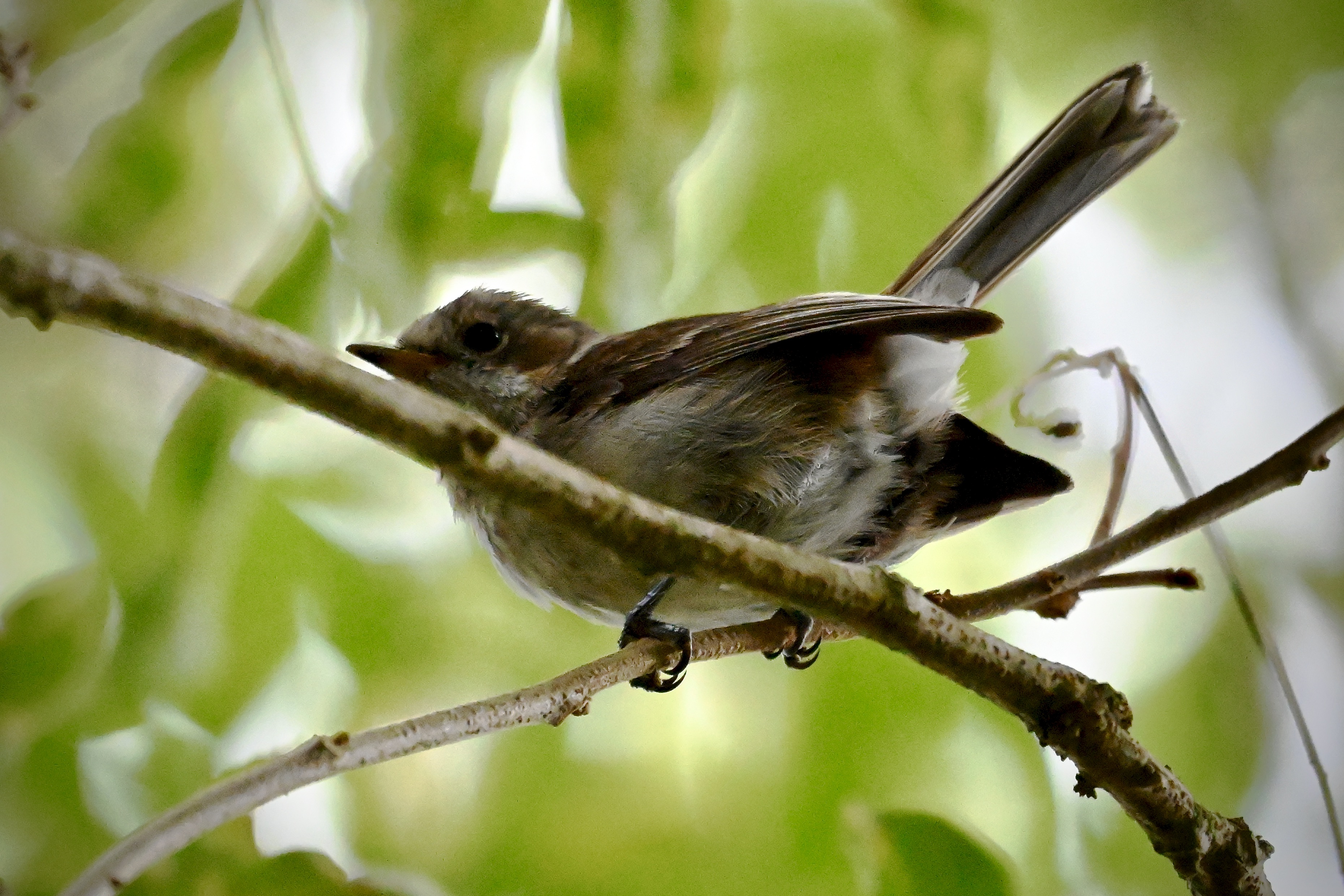 An 'elepaio: a small bird with mottled brown and cream feathers perched on a branch.