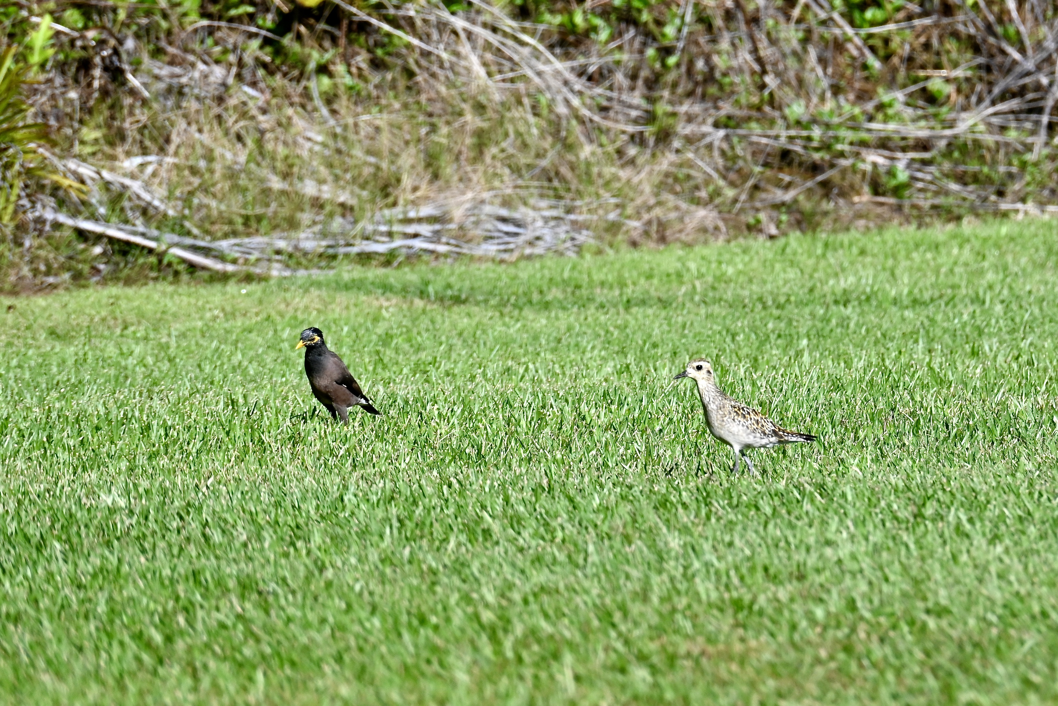 Photo of a myna (on left) and a kolea (on right) by Eric Anderson.