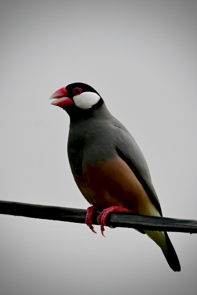The common waxbills may be the smallest birds in Hawai’i – meaning how big the adults get. Newly hatched chicks even of very large birds can be smaller. But if you see a very small bird with a rosy beak, it’s likely to be a common waxbill.