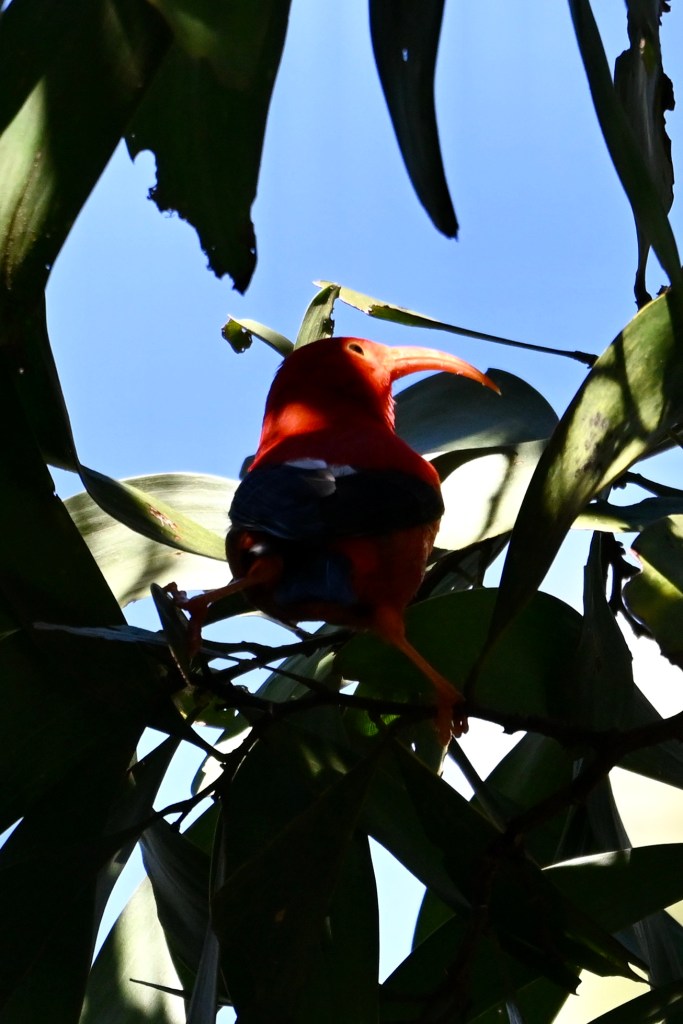 He had a friend who was one of the most effective bullies around. Where some of the aggressive i’iwi would chase an ‘apapane for a couple of feet, he’d chase them for a twice or three times as far. Sometimes he’d chase a bird so far that he’d find another bird in the place where he’d started, and he’d chase that one, too. If that seems like extra work to you, it does to me, too. Still, he was flashy (but then, all i’iwi are pretty flashy) and he was popular (as long as he wasn’t chasing you).