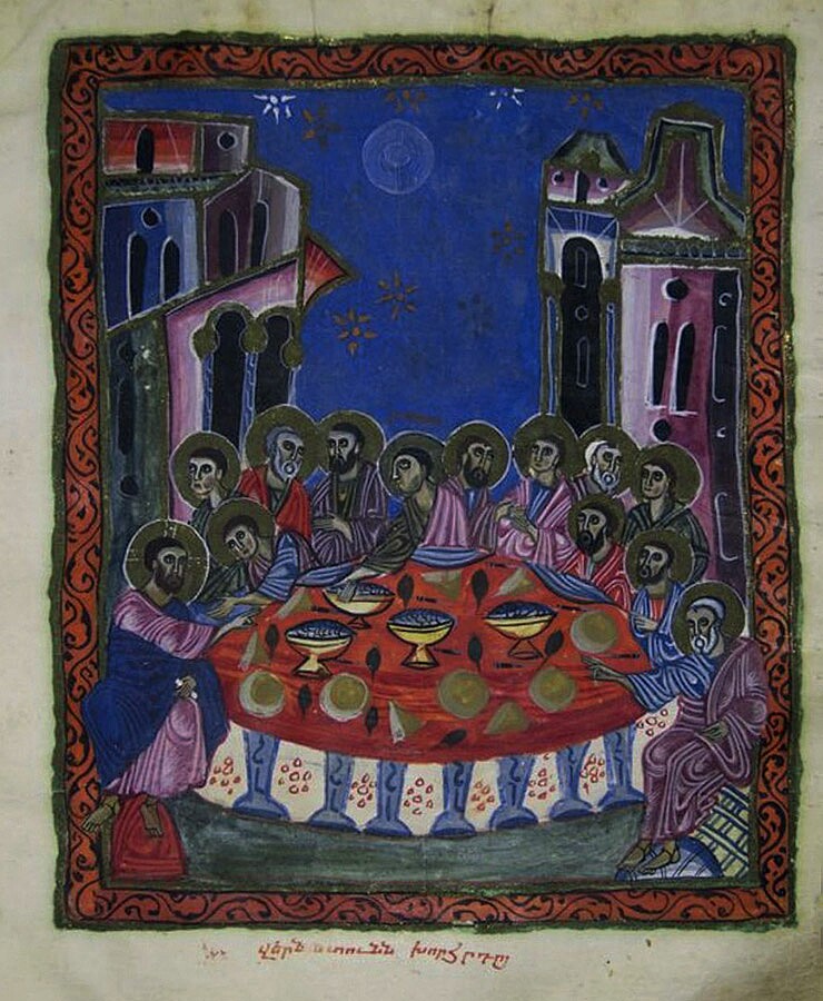 The image is a page from the Targmanchats Gospels (1232), ms2743 Matenadaran collection. Photo by Grigor – https://regionalpost.org/en/articles/a-treasury-of-medieval-thought-in-a-modern-institution.html, Public Domain, https://commons.wikimedia.org/w/index.php?curid=119401477.