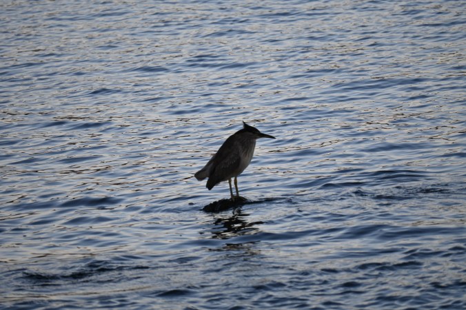 The auku’u, or black crowned night heron, likes to eat. If you look out along the shallows of Hilo Bay, or in the rivers of the valleys, you’ll find auku’u perched on rocks or grass or just standing in the water looking for fish. Although they’re called “night herons” in English, in Hawai’i auku’u fish during the day, and do pretty well at it.