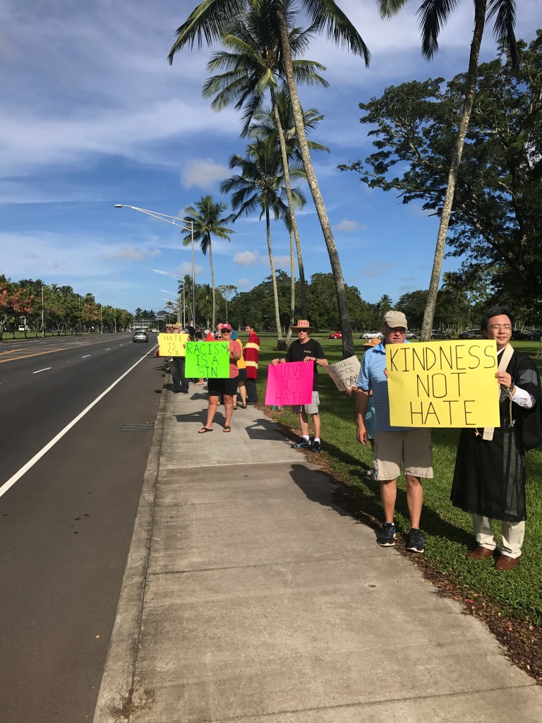 The nation’s leadership failed to condemn the racist and anti-Semitic platforms of the marchers, famously claiming there were “good people on both sides.” Demonstrations sprung up around the country condemning the white supremacist foundations of the Charlottesville rally, calling for repudiation of racist ideology, policy, and activity. Among the places was Hilo, Hawai’i. Interfaith Communities in Action gathered a small group for an hour’s roadside sign-waving on Monday, August 28, 2017.